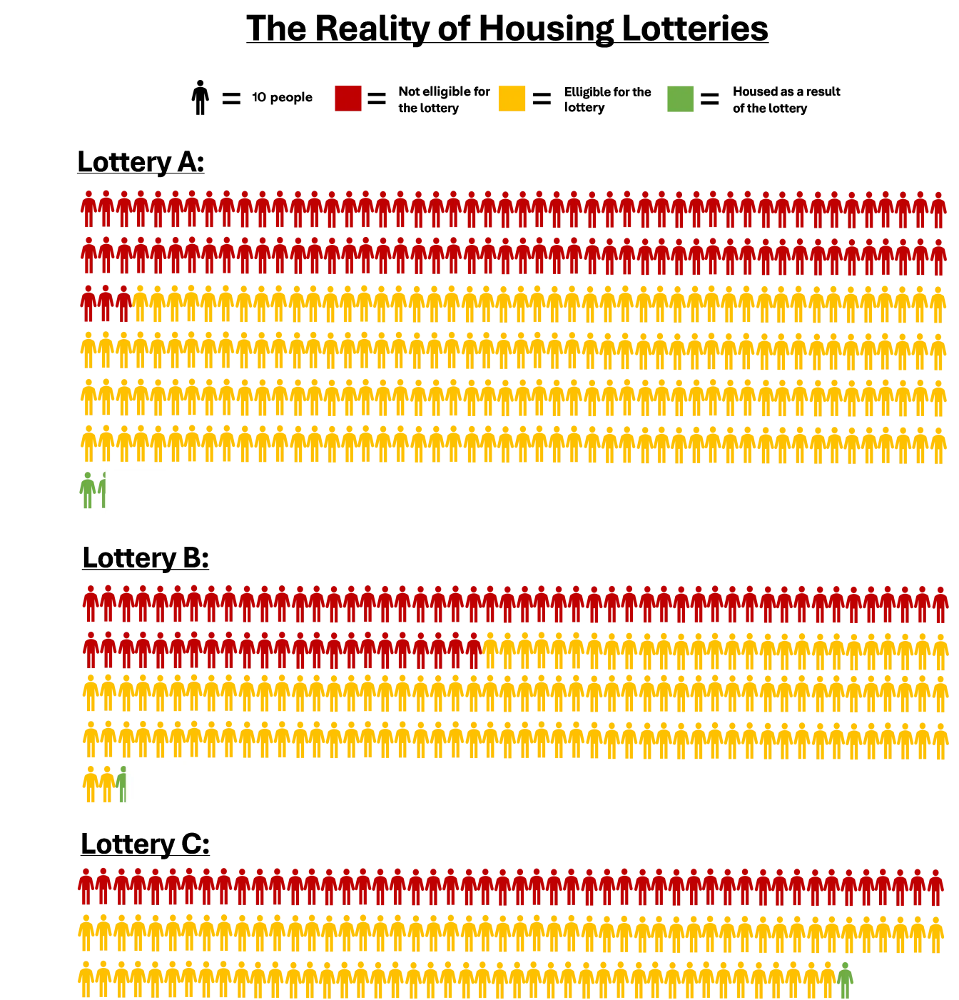 - Only a small percentage of eligible applicants who need affordable housing will find a solution in a lottery; the current housing doesn’t address the needs of those applying.